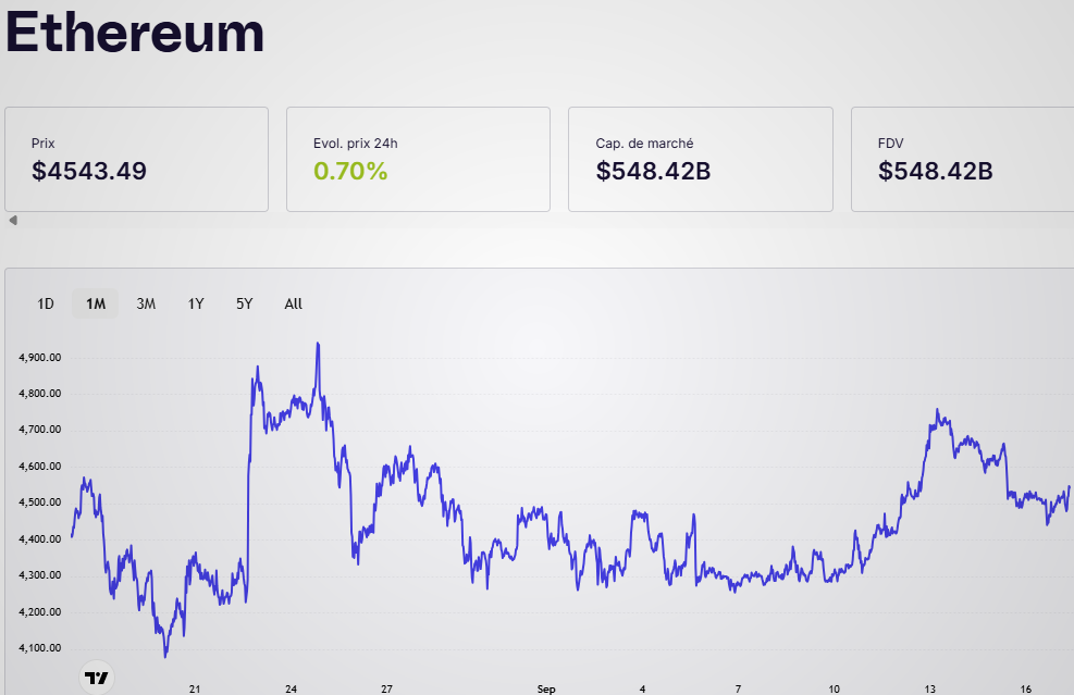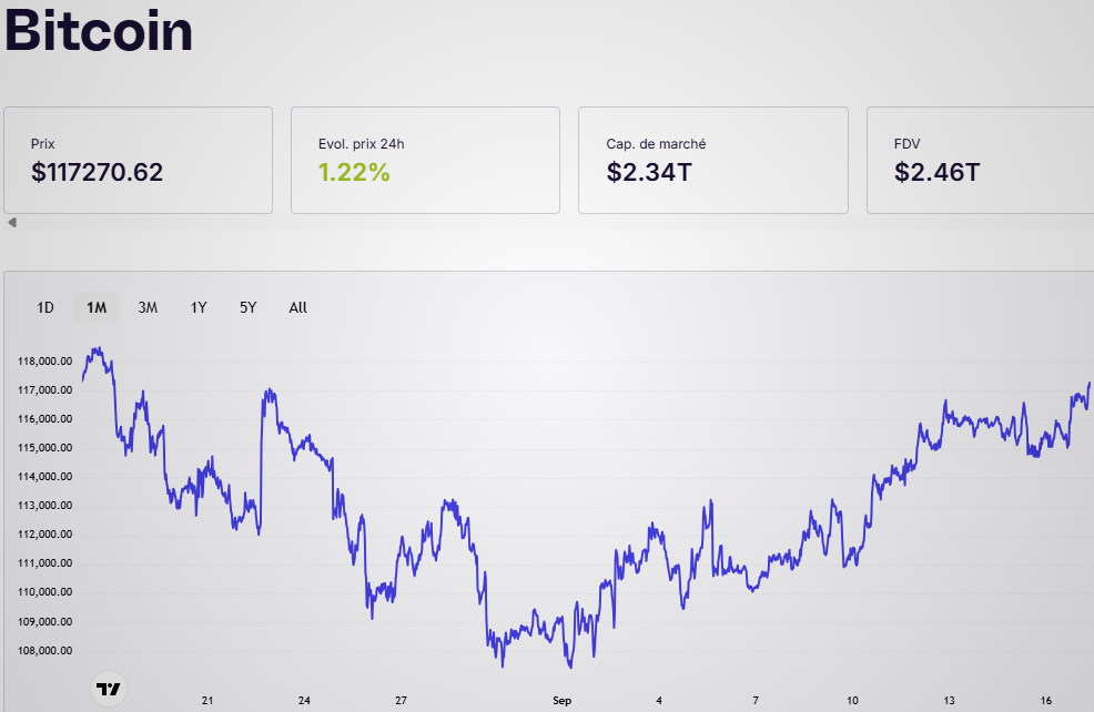 17 Sep 2025 Marché Etat du Marché Crypto (37) Valorisation de Bitcoin sur 1 mois Valorisation d'Ethereum sur 1 mois Capitalisation des stablecoins Actifs sous gestion des ETF Bitcoin Rendement des stablecoins en DeFi Etat des Indicateurs On Chain Written by: Frédéric Juret-Rafin Member discussion: