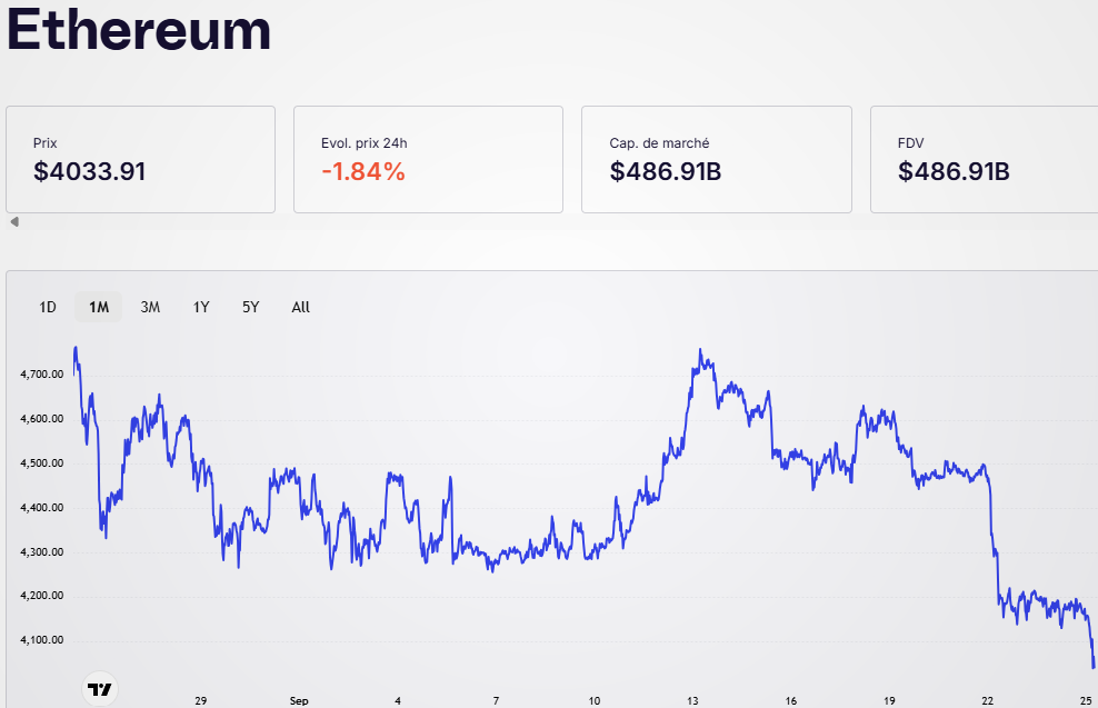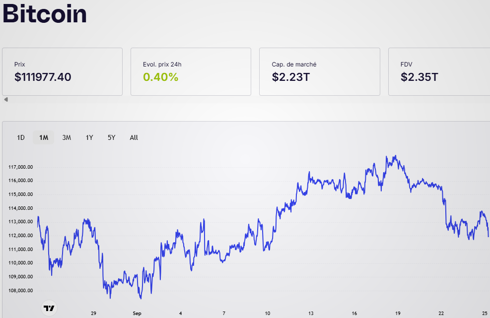25 Sep 2025 Marché Etat du Marché Crypto (38) Valorisation de Bitcoin sur 1 mois Valorisation d'Ethereum sur 1 mois Capitalisation des stablecoins Actifs sous gestion des ETF Bitcoin Rendement des stablecoins en DeFi Etat des Indicateurs On Chain Written by: Frédéric Juret-Rafin Member discussion: