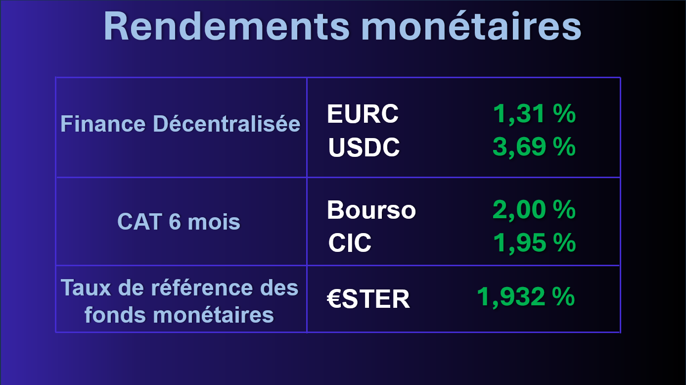Cette semaine, le rendement servi par l'EURC (Circle) reste faible à 1,31% en moyenne annualisée. Celui de l'USDC est stable à 3,69%.