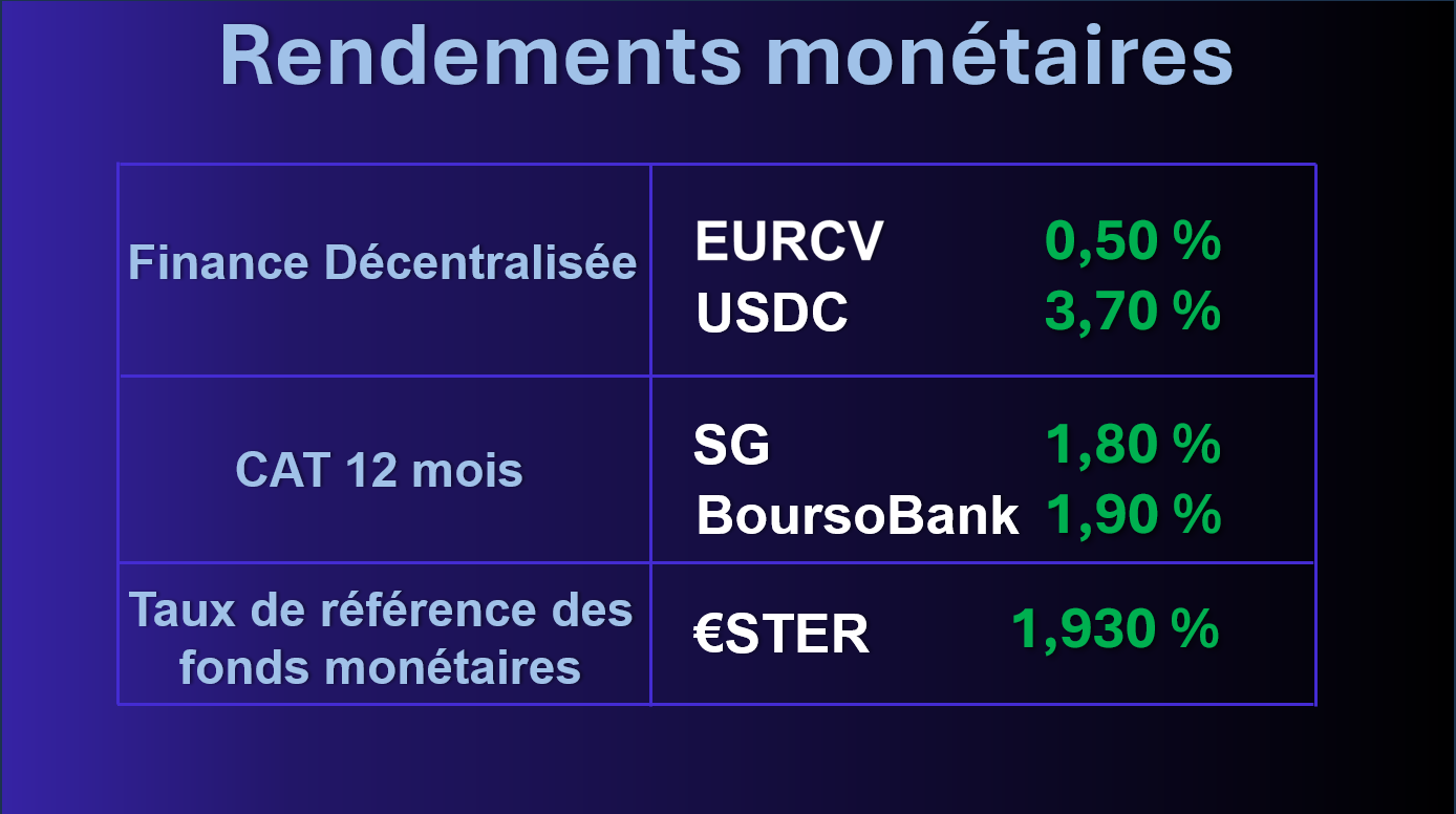 Cette semaine, le rendement servi par l'EURCV (Société Générale) chute à 0,50% en moyenne annualisée. Celui de l'USDC remonte légèrement à 3,70%.