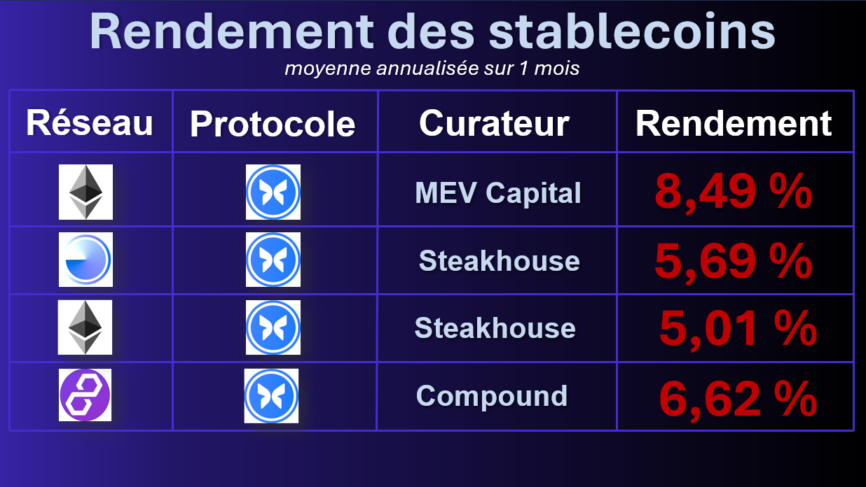 Les rendements sur les protocoles de lending sont en baisse. LโUSDC sert 8,49 % sur Ethereum (curateur : MEV Capital) en moyenne mensuelle.