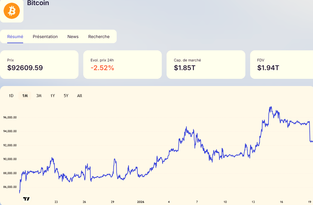 Evolution du cours de Bitcoin sur 1 mois