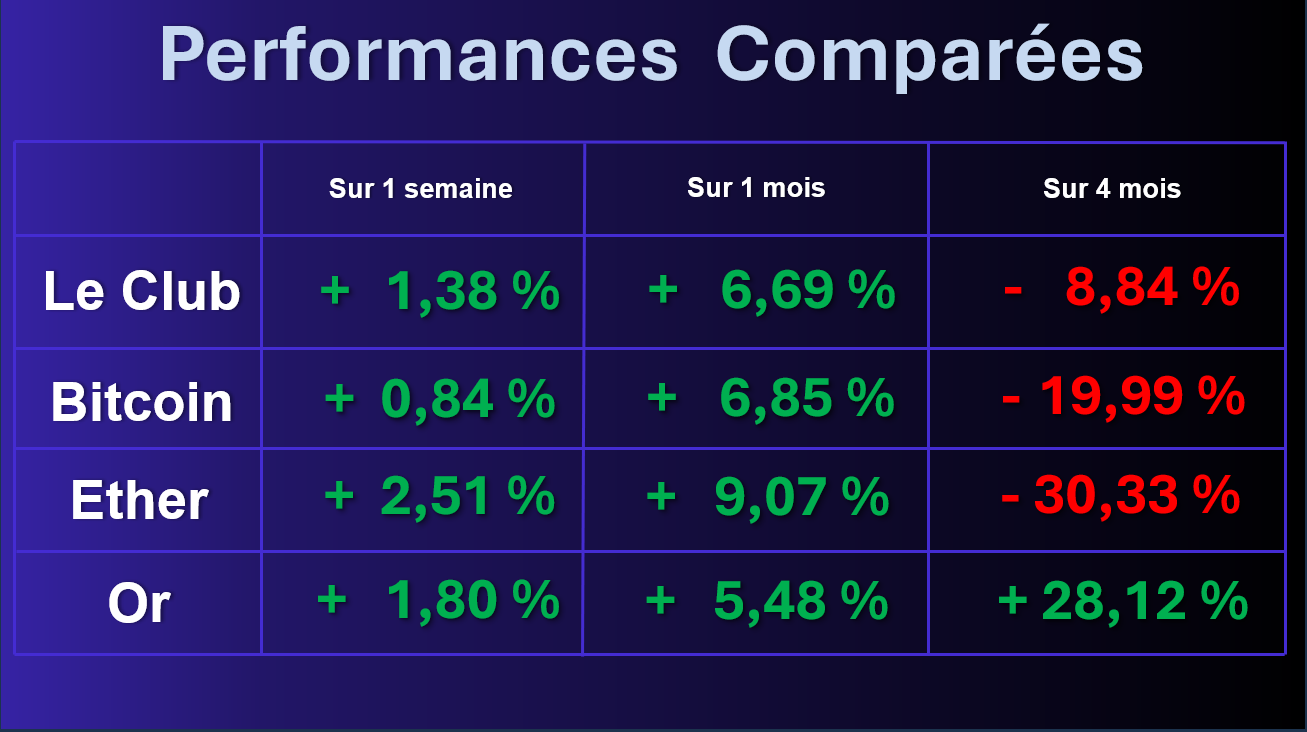 Le portefeuille repasse en positif à court terme malgré la correction et le retour de Bitcoin dans son range. La bonne tenue de l'or sur la période permet d'accroître sa surperformance à long terme par rapport à Bitcoin.