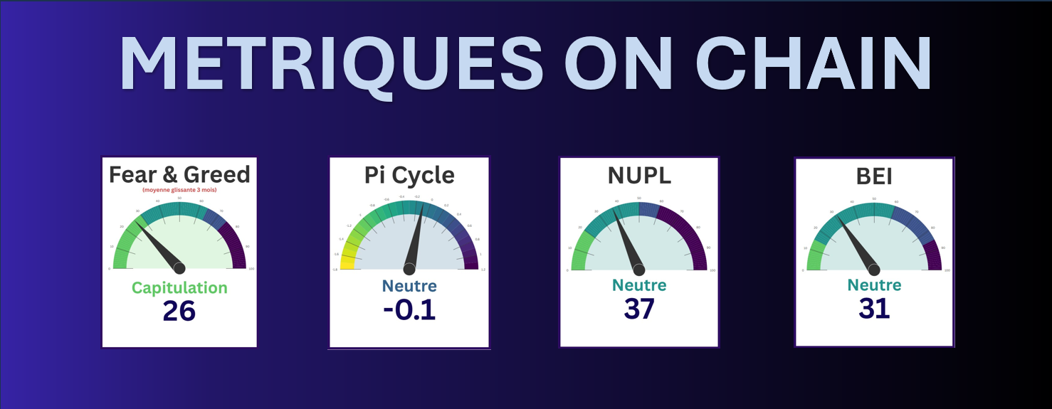 Malgré la correction, les indicateurs n'évoluent qu'à la marge cette semaine. Seul le Fear and Greed 3 mois se maintient sous sa côte d'alerte.