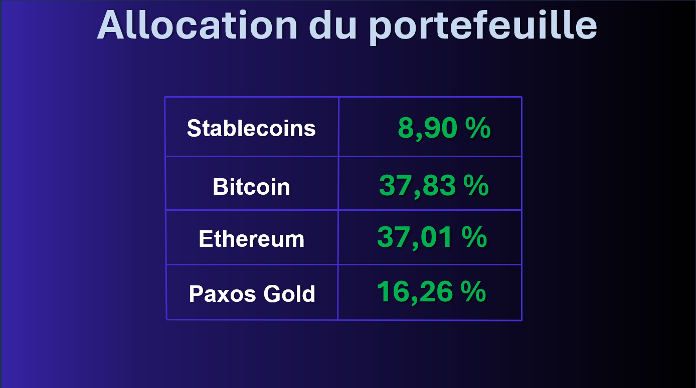 Une majorité d'investisseurs ont décidé de profiter de l'amplification de la correction pour renforcer les positions sur Bitcoin et Ethereum. La poursuite de la hausse de l'or augmente mécaniquement son pourcentage dans le portefeuille.