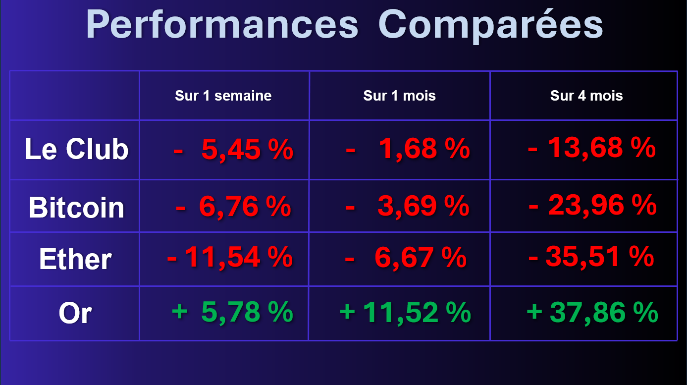 Le portefeuille repasse en négatif à court terme du fait de l'amplification de la correction. La bonne tenue de l'or sur la période compense la nette sous-performance d'Ethereum et permet de maintenir sa surperformance par rapport à Bitcoin sur toutes les échelles de temps.