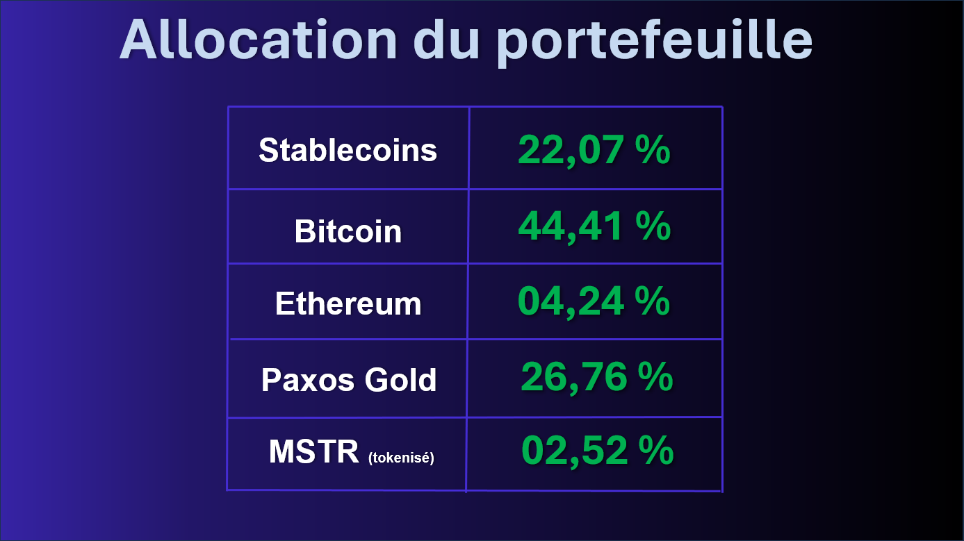 Les conditions de marché n'ayant pas fondamentalement bougé cette semaine, les allocations restent inchangées à ce stade. Le contexte reste, bien entendu, favorable à une ré accumulation donc à des entrées en DCA.