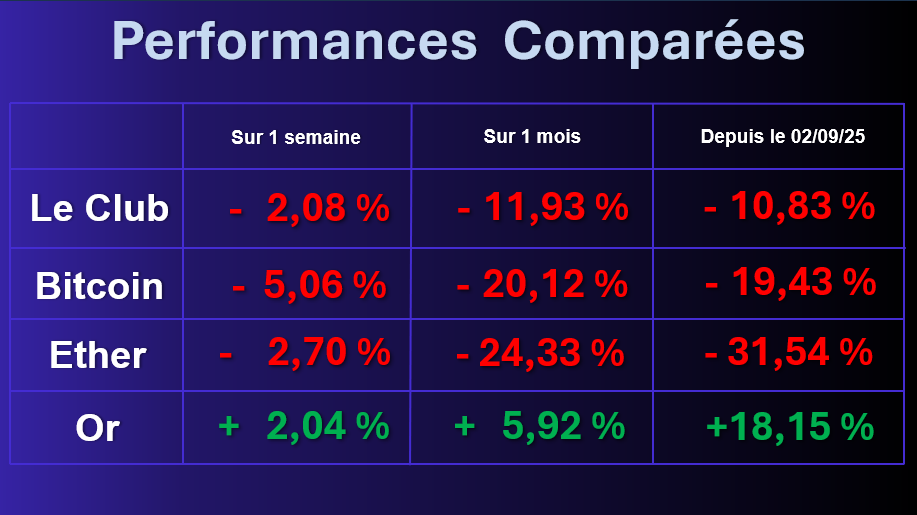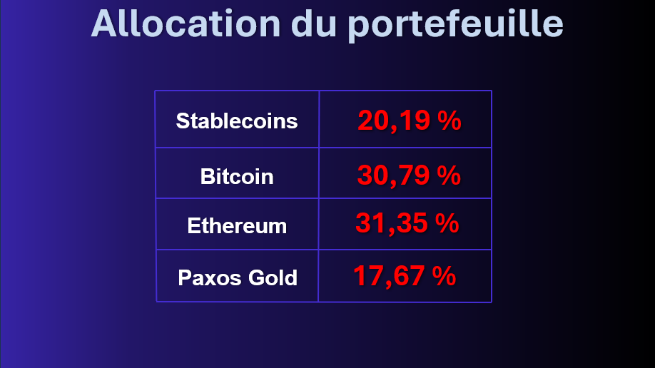 Malgré la correction en cours, l'allocation du portefeuille continue à porter les effets escomptés : en écrasant la volatilité, il diminue drastiquement la baisse du portefeuille tout en continuant à surperformer Bitcoin, désormais assez nettement. L'allocation en or tokenisé et le placement des EURCV sur Morpho jouent toujours pleinement leur rôle d'amortisseur. La surperformance par rapport à Ethereum est encore plus nette.