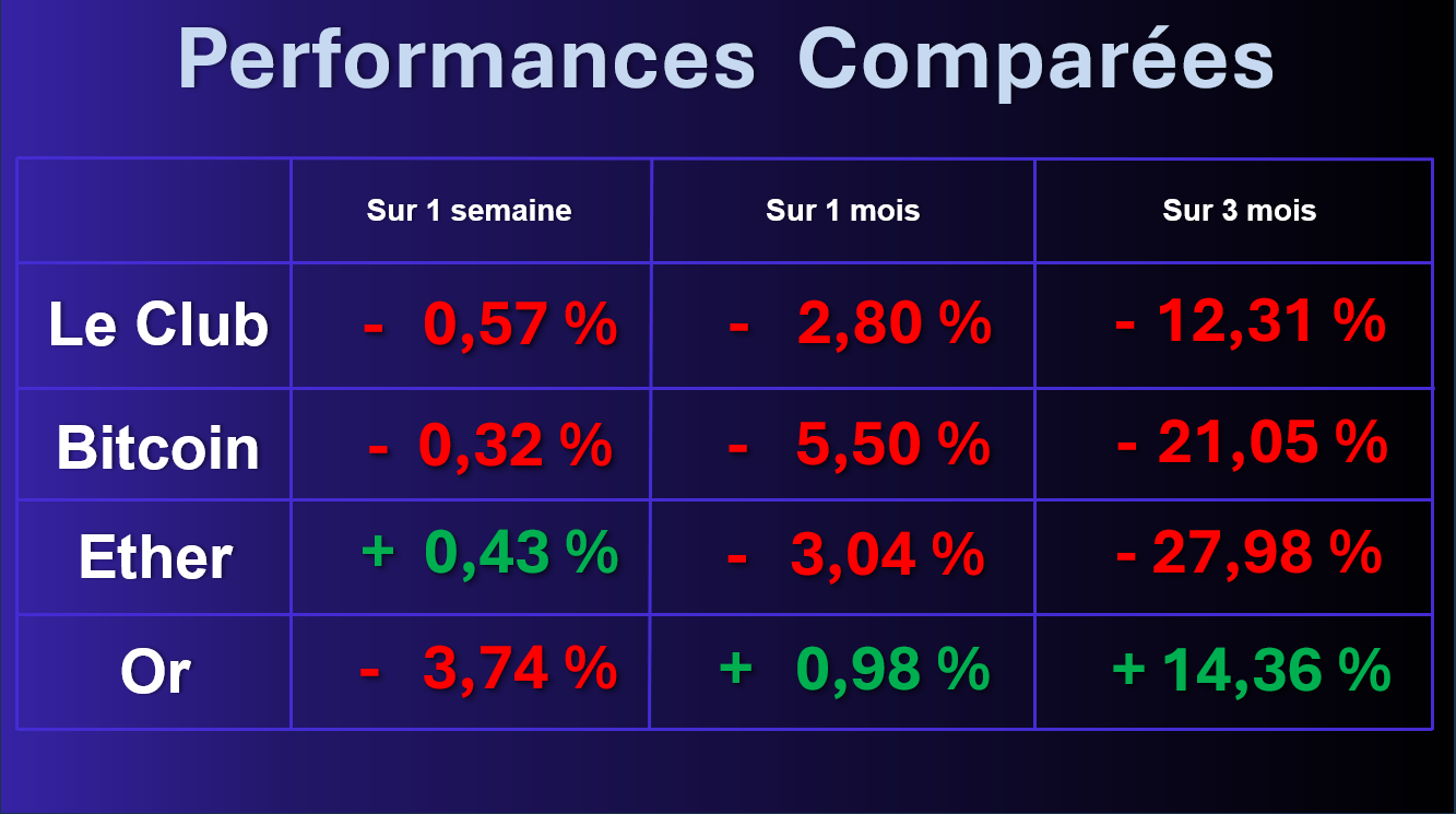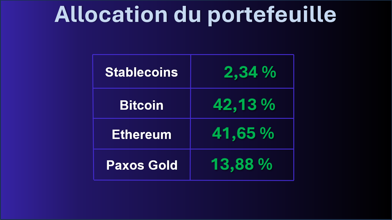 Le portefeuille est relativement stable sur la semaine malgré le léger repli de l'or. Il continue à surperformer largement Bitcoin et Ethereum sur le moyen terme. L'allocation en or tokenisé et en EURCV jouent toujours pleinement leur rôle d'amortisseur à la baisse.
